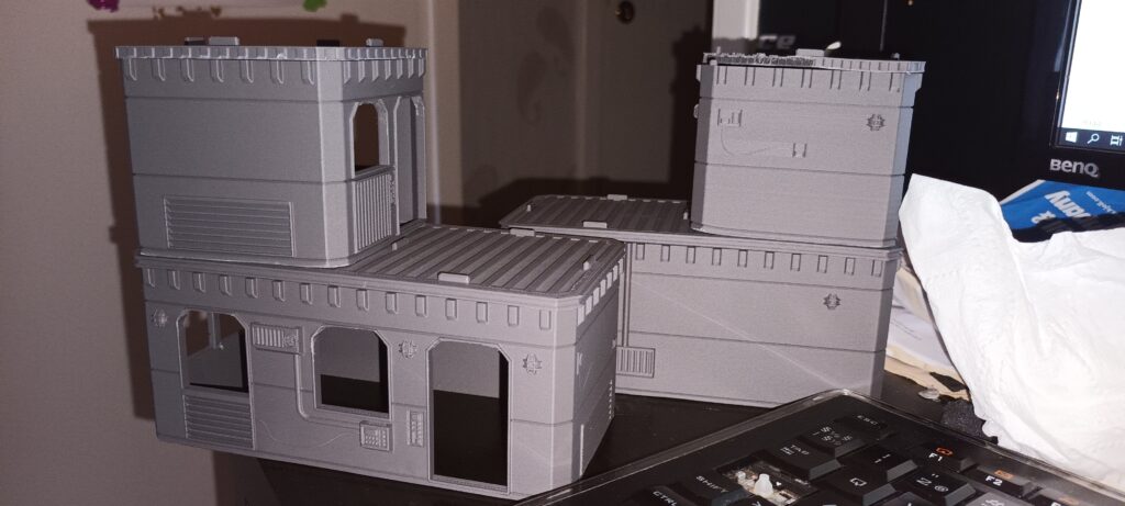 Den stackars skrivaren är reparerad och delvis uppgraderad. Följande (snabbtagna) bilder är på modulhus från ”Vanguard Terrain”-kollektionen, och husen är utskrivna efter att reparationen genomfördes. Det kan fortfarande behövas lite kärlek i dörr-, och fönsteröppningar där jag inte riktigt kunnat få till en fullständig fastgjutning av filamenten.