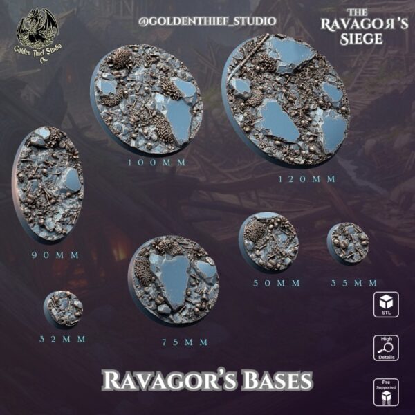 | Bases - Ravagor's Siege - Gnolls | Base 32 mm, Base 35 mm, Base 50 mm, Base 75 mm, Base – Oval – 90 mm, Base 100 mm, Base 120 mm |