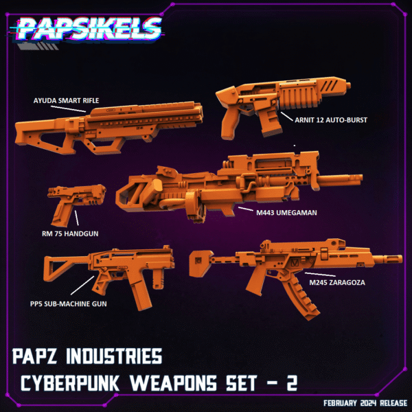 | Cyberpunk Weapons Set 2 | All Weapons, Arnit 12 Auto-Burst, Ayuda Smart Rifle, M245 Zaragoza, M443 Umegaman, PP5 Sub-Machine Gun, RM 75 Handgun |