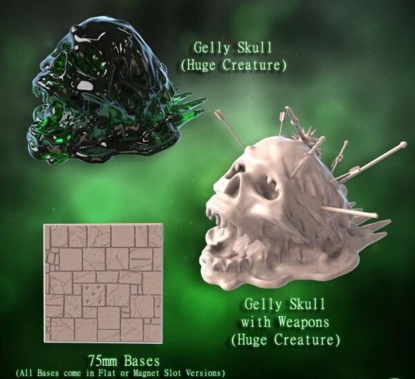 | Gelly Skull | Gelatinous Skull – No Weapons, Gelatinous Skull – With Weapons, 75mm Square Base v.2 – No Slots for Magnets, 75mm Square Base v.2 – Made for Magnets |