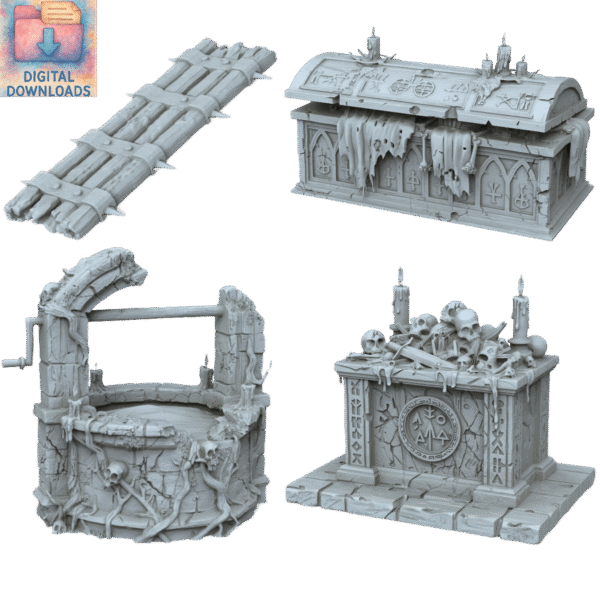 | Thanaris Ruins - Tillbehör | 28mm – Altare (Resin), 28mm – Brunn (Resin), 28mm – Sarkofag (Resin), 28mm – Bro (Resin), 32mm – Altare (Resin), 32mm – Brunn (Resin), 32mm – Sarkofag (Resin), 32mm – Bro (Resin), STL-filer |