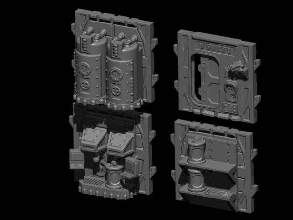 - 1x Wide Medbay Wall with two pillars, and two doors, one of which is slotted and movable, and also with a window with room for acetate plastic (not included).