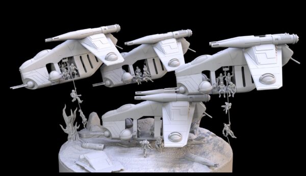 Skala 1:48 (Det går givetvis att förändra storleken efter önskemål, men då behöver du kommunicera detta). Fordonet (LAAT = Low Altitude Assault Transport) i bakgrunden säljs separat i rullistan.
