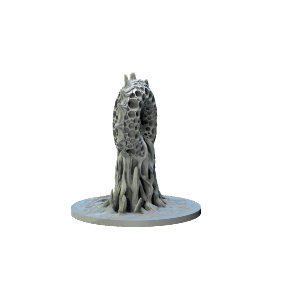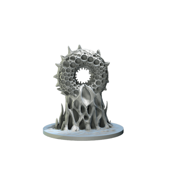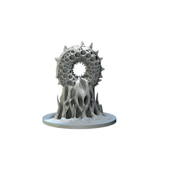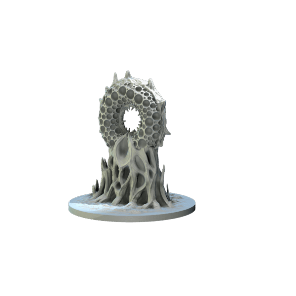 ”The Mouth of the Abyss is a towering, otherworldly structure with a porous, bone-like texture. It appears as a twisted and organic portal, surrounded by irregular, hole—ridden spires reminiscent of a surreal and grotesque coral or bone growth. Its central void seems to act as a gateway, with edges that spiral inward, suggesting a passage to an eldritch dimension.”