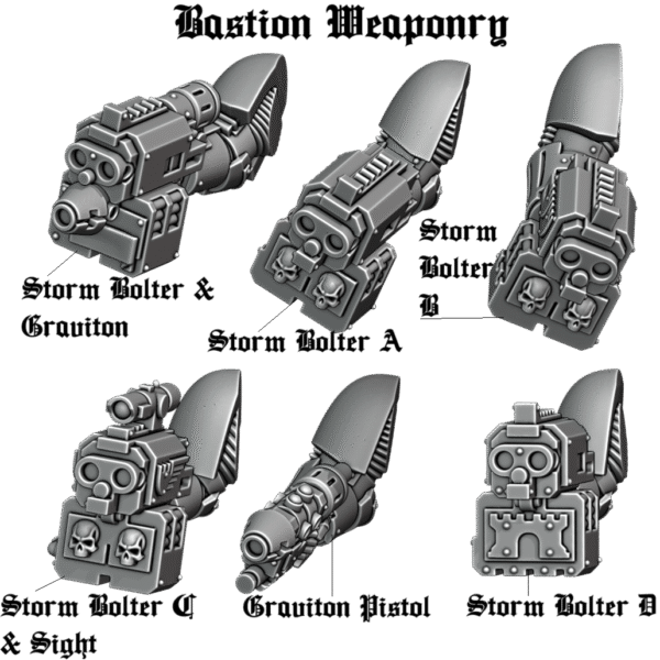 | Storm Bolters & Arms | Storm Bolter & Graviton – Right, Storm Bolter & Graviton – Left, Stor Bolter A – Right, Storm Bolter A – Left, Storm Bolter B – Right, Storm Bolter B – Left, Storm Bolter C & Sight – Right, Storm Bolter C & Sight – Left, Graviton Pistol – Right, Graviton Pistol – Left, Storm Bolter D – Right, Storm Bolter D – Left |