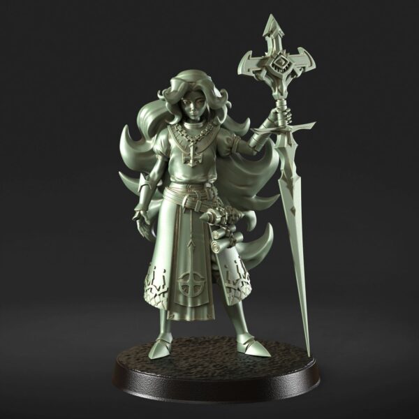 ”Her attire consists of flowing robes embroidered with arcane symbols and delicate elven patterns. She carries an ancient tome, and a staff topped with a glowing crystal, reflecting her pursuit of knowledge and magical prowess.”